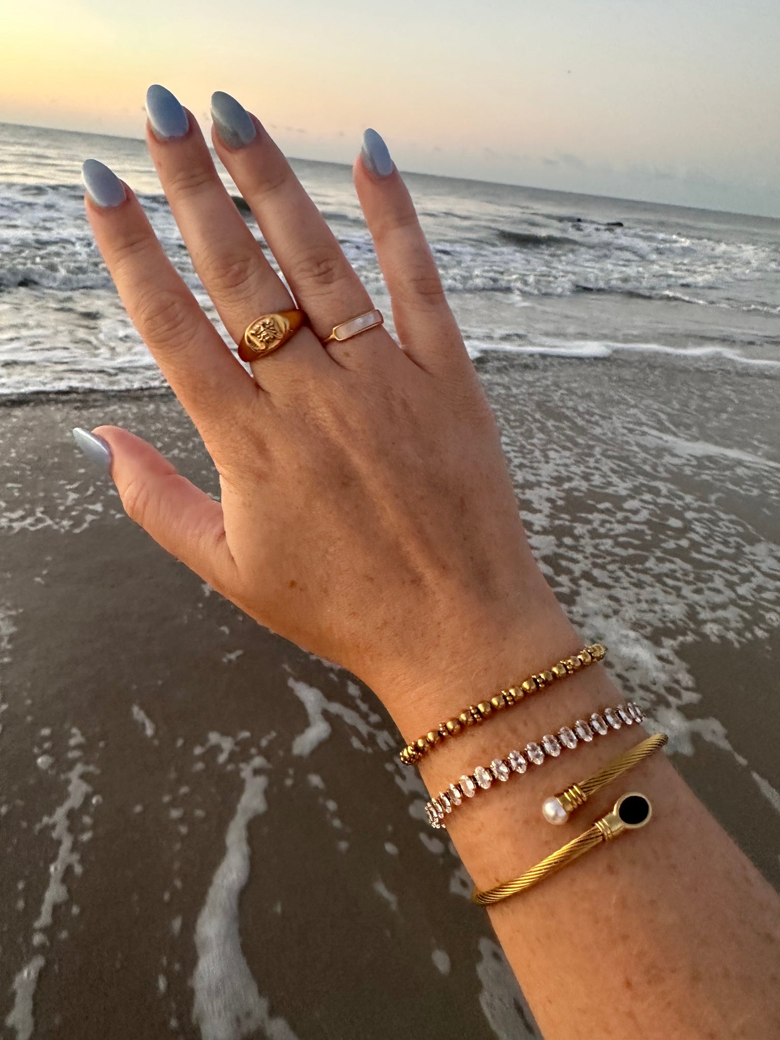 18k gold stainless steel round and floral-esque beads, my new favorite! Seriously so cute and it is stretchy so it fits many sizes.
